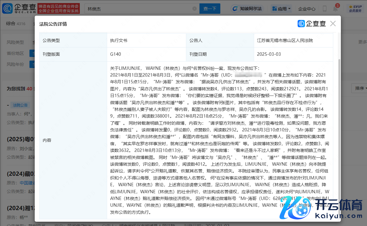 企查查APP涌现,3月3日,何某因未通过涉案账号“Mr-涛哥”发布向LIMJUNJIE,WAYNE(林俊杰)的赔礼说念歉声明,字据判决书的本色及LIMJUNJIE,WAYNE(林俊杰)的肯求,法院以发布公告的神气引申。