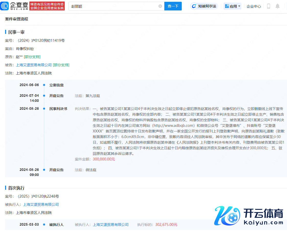 企查查APP认知,近日,上海艾堡生意有限公司新增一则被试验东说念主信息,试验意见超30万元,波及赵丽颖与其肖像权纠纷一案世界杯体育,试验法院为上海市奉贤区东说念主民法院。